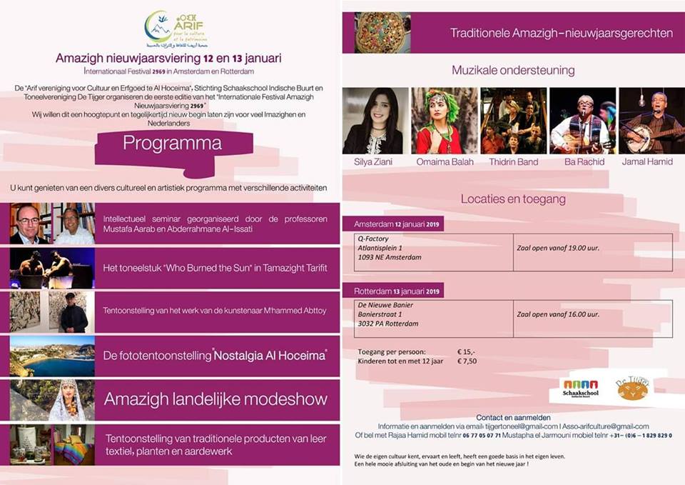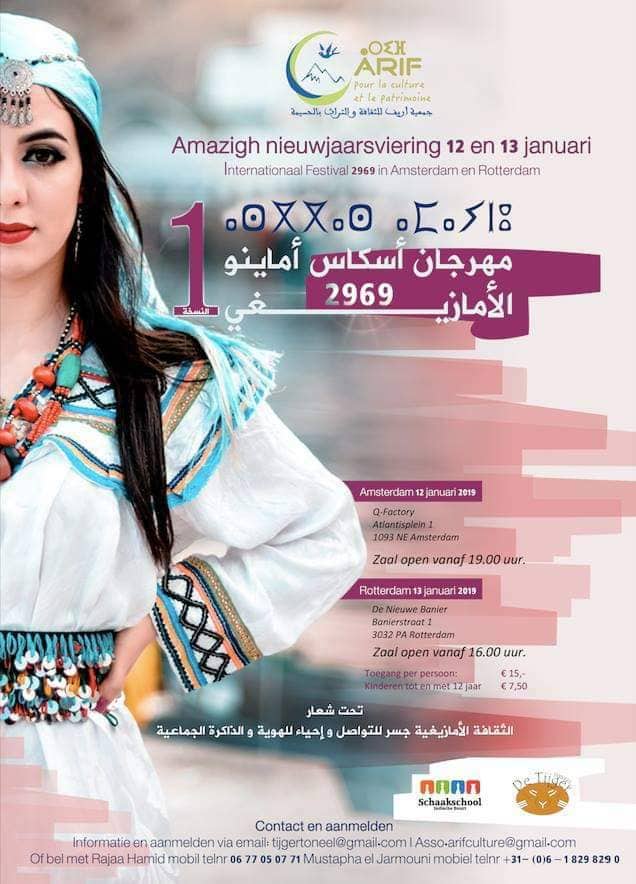 بمناسبة السنة الأمازيغية الجديدة 2969، تنظم جمعية أريف للثقافة والتراث بالحسيمة وشركائها، مهرجان الثقافة الأمازيغية في نسخته الأولى أسكاس أماينو 2969 بهولندا.