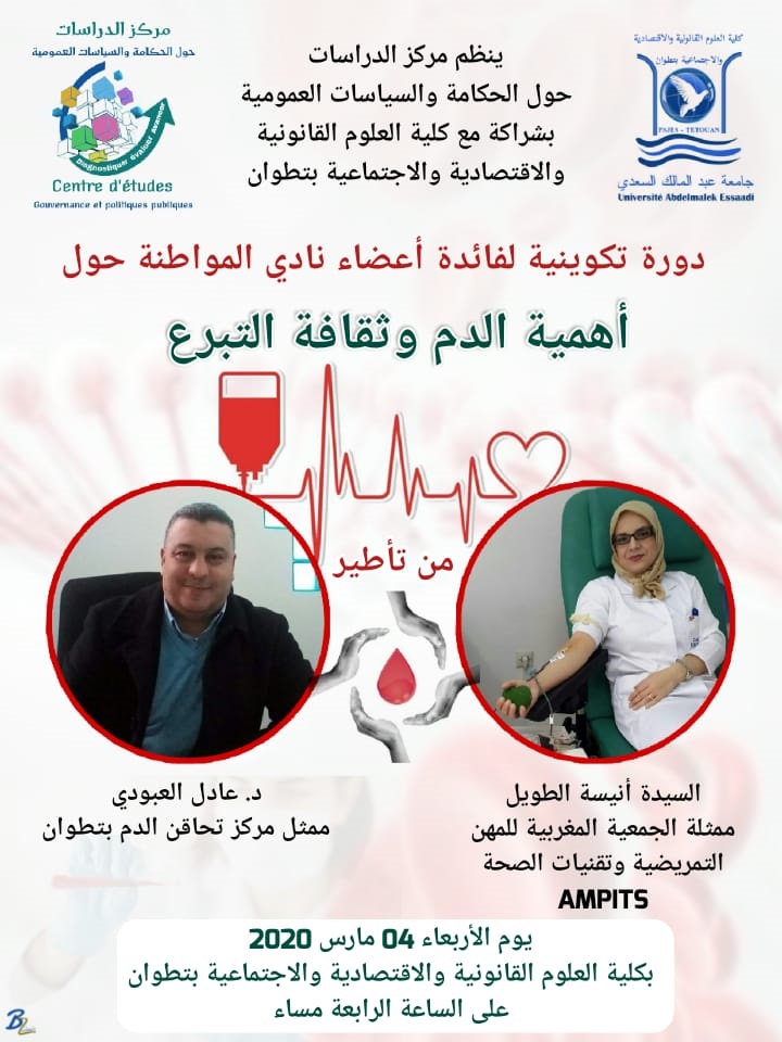 ينظم مركز الدراسات حول الحكامة والسياسات العمومية بشراكة مع كلية العلوم القانونية والإقتصادية والإجتماعية بتطوان، دورة تكوينية لفائدة أعضاء نادي المواطنة حول “أهمية الدم وثقافة التبرع“، من تأطير السيدة أنيسة الطويل، ممثلة الجمعية المغربية للمهن التمريضية وتقنيات الصحة AMPITS، والدكتور عادل العبودي، ممثل مركز تحاقن الدم بتطوان.