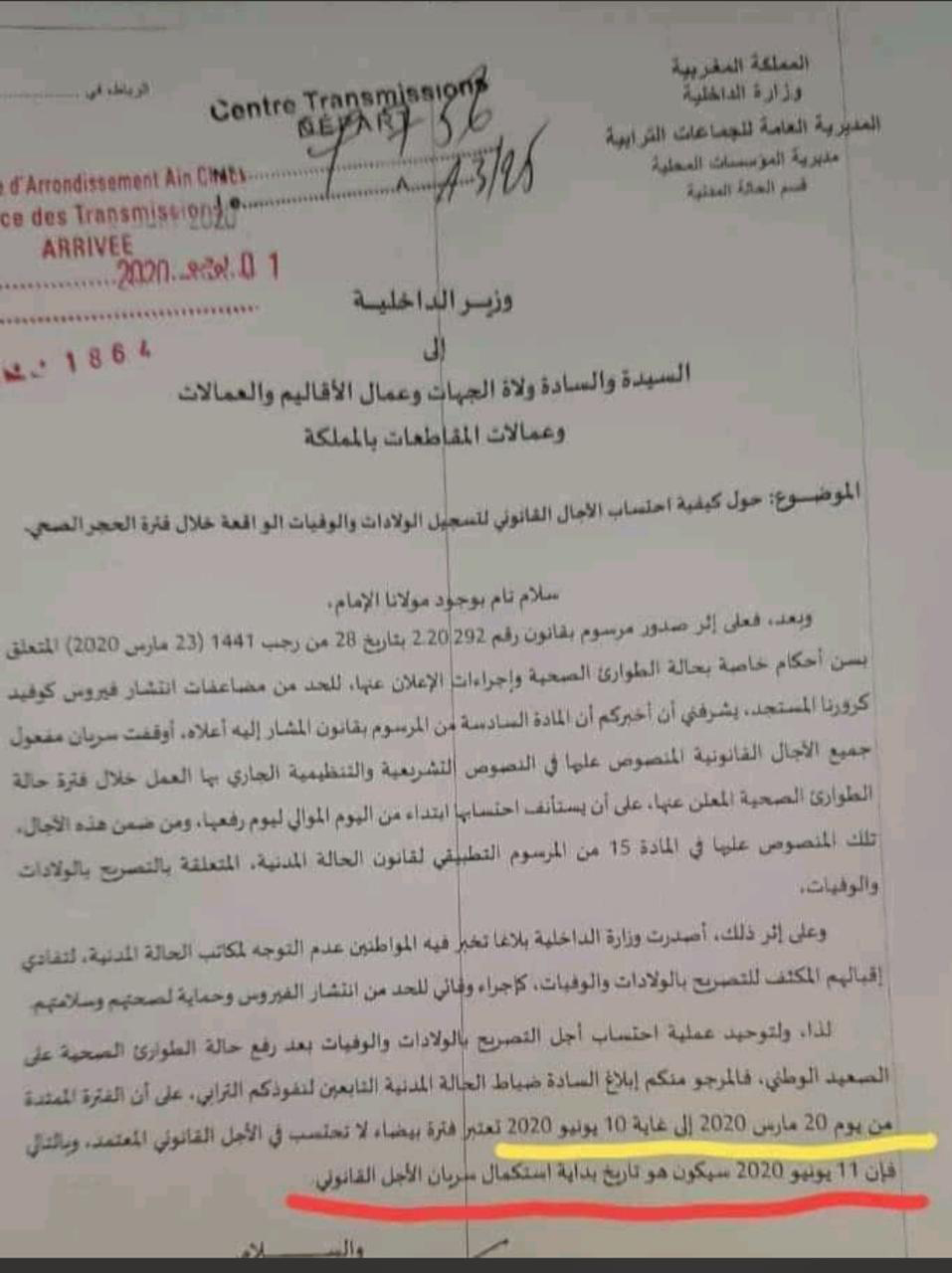 وحسب ما جاء في المراسلة الموجهة من طرف وزير الداخلية للولاة والعمال بشأن كيفية احتساب الاجال القانونية لتسجيل الولادات والوفيات الواقعة خلال فترة الحجر الصحي، فإن الولاة والعمال مدعوين لابلاغ ضباط الحالة المدنية، على ان الفترة الممتدة من 20 مارس الى 10 يونيو 2020 تعتبر فترة بيضاء لا تحتسب في الاجل القانوني المعتمد، وبالتالي فإن 11 يونيو 2020 سيكون هو تاريخ بداية استكمال سريان الاجل القانوني.