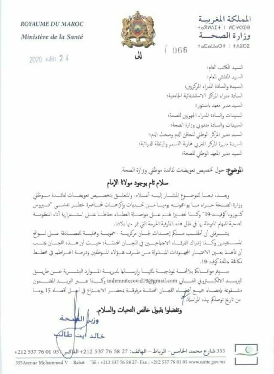 راسل وزير الصحة خالد أيت الطالب، أمس الاثنين، مختلف المندوبيات الإقليمية و المديريات الجهوية و باقي المراكز التابعة لها، بهدف الشروع في إحصاء الأطر الطبية المستحقة لتعويضات كورونا.