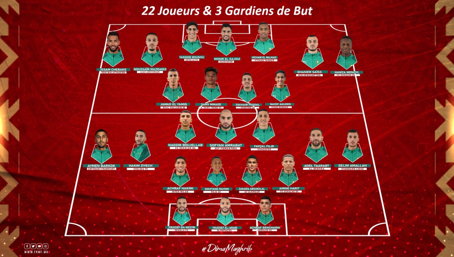 ياسين بونو ( إشبيلية) – منير المحمدي ( هاتاي سبور)- هشام المجهد ( إتحاد طنجة) رومان غانم سايس( ولفرهامبتون)-أشرف حكيمي(إنتر )-نصير مزراوي(أياكس أمستردام)-نايف أكرد (رين)-زهير فضال (سبورتينغ لشبونة) – سامي مايي ( سان تروند البلجيكي)-عصام شباك ( مالتيا سبور )- حمزة منيدل ( شالك)-جواد يميق(بلد الوليد)- سفيان أمرابط ( فيورنتينا)- حكيم زياش (تشيلسي)-سليم أملاح ( سطاندار دولييج)-أيمن برقوق (إينتراخت فرانكفورت )-نسيم بوجلاب(شالك)عادل تاعرابت( بنيفيكا)-فيصل فجر(سيفاس سبور) – يوسف النصيري ( إشبيلية)- يوسف العربي ( أولمبياكوس)-أشرف بنشرقي ( الزمالك المصري)- سفيان رحيمي( الرجاء البيضاوي)-أمين حارث ( شالك)-زكرياء أبو خلال ( أزد ألكمار).