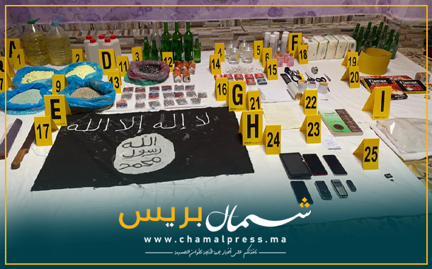 وتابع المصدر أن عمليات التفتيش التي أجراها ضباط المكتب المركزي للأبحاث القضائية وخبراء مسرح الجريمة بهذا المسكن الأخير، وبمنازل المشتبه فيهم، أسفرت عن حجز راية من الثوب تجسد شعار تنظيم “داعش”، ومخطوط ورقي يتضمن نص البيعة للخليفة المزعوم لهذا التنظيم، ومجموعة من الأسلحة البيضاء المتعددة الأنواع والمختلفة الأحجام، ومعدات معلوماتية وأجهزة إلكترونية.