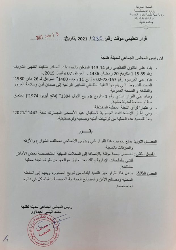 وقالت جماعة طنجة إن اتخاذ “هذه الإجراءات التنظيمية والتي لا تعني المس بالشعيرة والتقاليد المصاحبة لها، بل المحافظة عليها وفق شروط وظروف العصر والصحة والسلامة والأمن العمومي”.