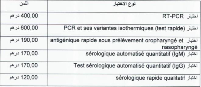 كشفت وزارة الاقتصاد والمالية وإصلاح الإدارة عن الأسعار الجديدة للاختبارات الخاصة بكشف فيروس كوفيد-19 بعد قرارها تقنين أسعار هذه الاختبارات وتحديد أسعارها القصوى.
