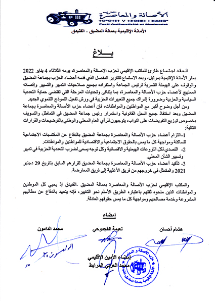- تأكيد أعضاء حزب الأصالة والمعاصرة بجماعة المضيق لقرارهم السابق بتاريخ 29 دجنبر 2021 والمتمثل في خروجهم من فريق الأغلبية إلى فريق المعارضة.