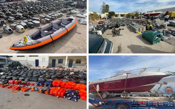 وقد مكنت عمليات التفتيش وإجراءات الحجز التي باشرتها عناصر الشرطة القضائية خلال هذه التدخلات الأمنية المركزة من حجز وسائل لوجيستيكية مهمة، تتمثل في 125 محركا بحريا، وثمانية زوارق مطاطية، ومجموعة كبيرة من معدات الملاحة البحرية عبارة عن أجهزة تحديد المواقع GPS، وسترات للنجاة وأجهزة توجيه وقياس للسرعة وحاويات للبنزين، فضلا عن حجز 66 صفيحة من مخدر الشيرا ودراجتين مائيتين وقاربين ترفيهيين وعشر سيارات تحمل بعضها لوحات ترقيم مزورة، والتي يشتبه في تسخيرها في هذه الأنشطة الإجرامية.