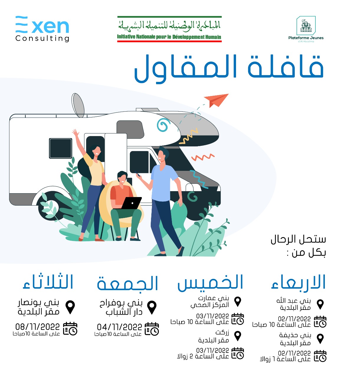 في إطار تنفيذ برنامج تحسين الدخل والإدماج الاقتصادي للشباب، تنظم المبادرة الوطنية للتنمية البشرية بإقليم الحسيمة، وبشراكة مع منصة شباب الحسيمة ومكتب الدراسات Exen Consulting، قافلة المقاول، التي ستحط الرحال (حسب البرنامج المنشور أسفله) إبتداءا من يوم الأربعاء، بكل من: