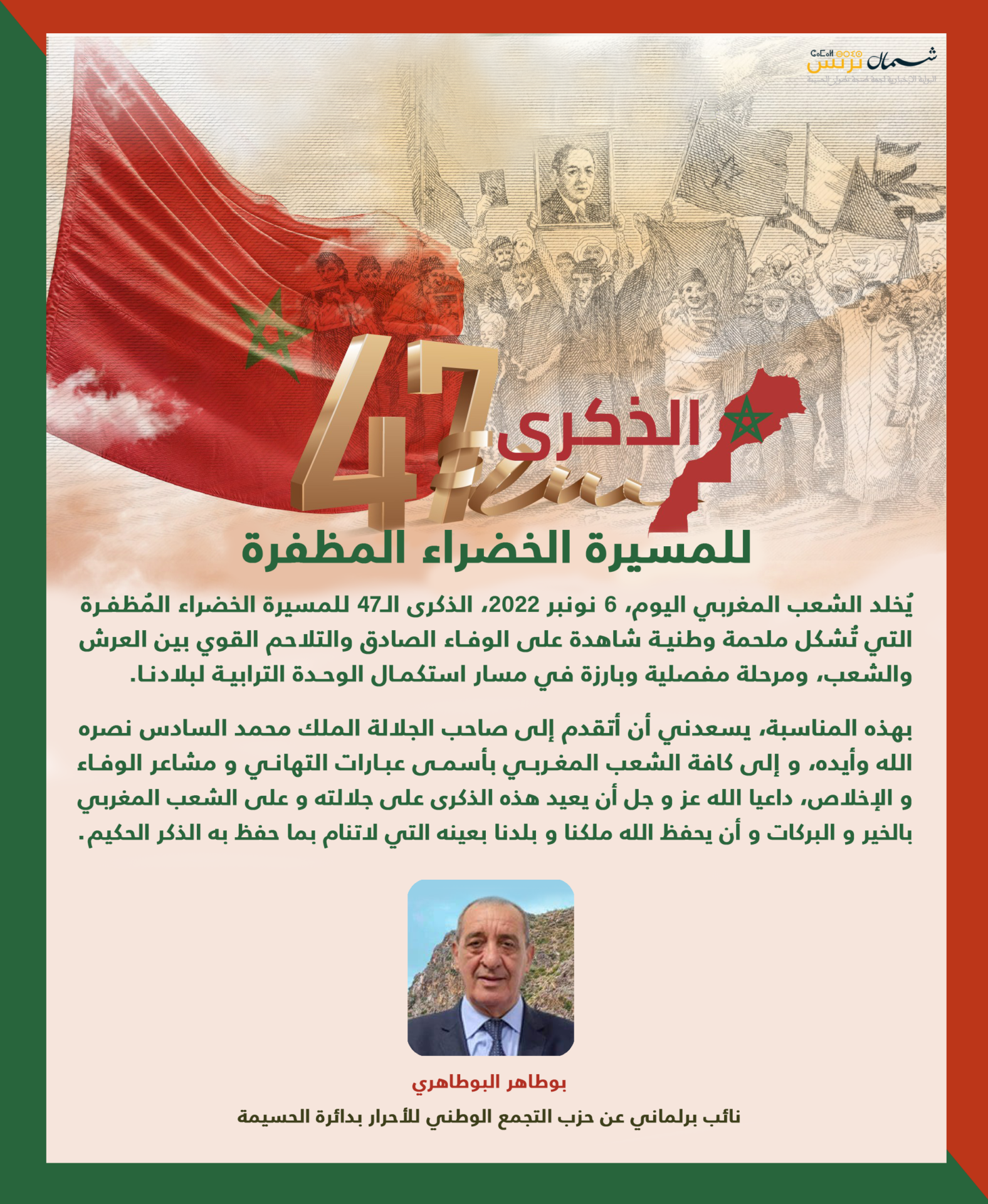 يخلد الشعب المغربي قاطبة وبكل مشاعر الفخر والاعتزاز، الذكرى السابعة والأربعون للمسيرة الخضراء المظفرة وهي حدث تاريخي عظيم يُجسد تلاحم العرش والشعب في مسار الكفاح من أجل استكمال الوحدة الترابية للمملكة، و مناسبة للوقوف على ما عرفته الأقاليم الجنوبية للمملكة، تحت القيادة الرشيدة لصاحب الجلالة الملك محمد السادس نصره الله وأيده، من مظاهر النمو والازدهار.