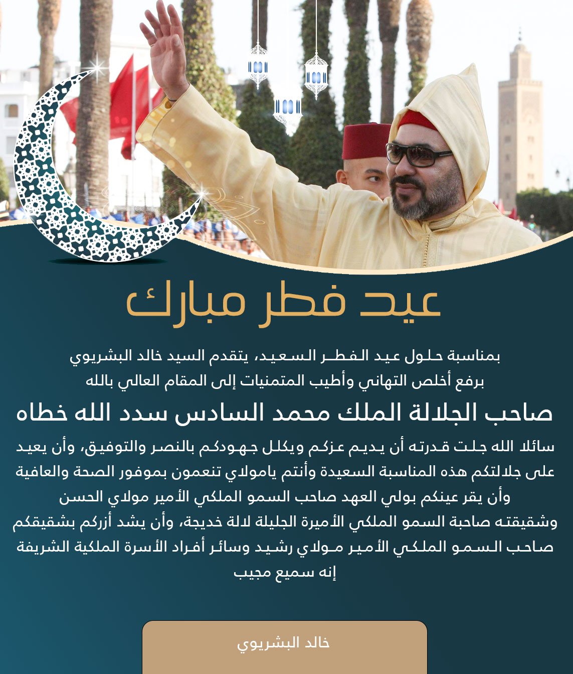 بأحر التهاني وأصدق آيات الولاء والإخلاص، متمنين لجلالته موفور الصحة و العافية، سائلين العلي جلت قدرته أن يبارك في عمر جلالته و يقر عينه بسمو ولي عهده المحبوب صاحب السمو الملكي الأمير مولاي الحسن و بكريمة جلالته المصون صاحبة السمو الملكي الأميرة لالة خديجة، و أن يشد أزره بشقيقه صاحب السمو الملكي الأمير مولاي رشيد و بكافة أفراد الأسرة الملكية الشريفة.