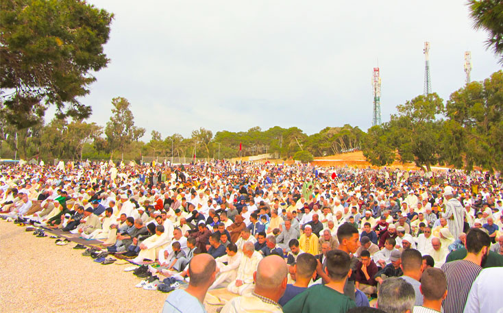 ومع تباشير الصباح؛ توافد جموع المصلين، مولّين وجهتهم إلى مختلف فضاءات إقامة شعائر العيد التي تشمل المشاركة في ترديد تكبيرات وفق صيغة وايقاعات تعارف عليها أهالي مدينة الحسيمة منذ القدم، ثم أداء ركعتي العيد اللتين يعقبهما الاستماع الى خطبة العيد.