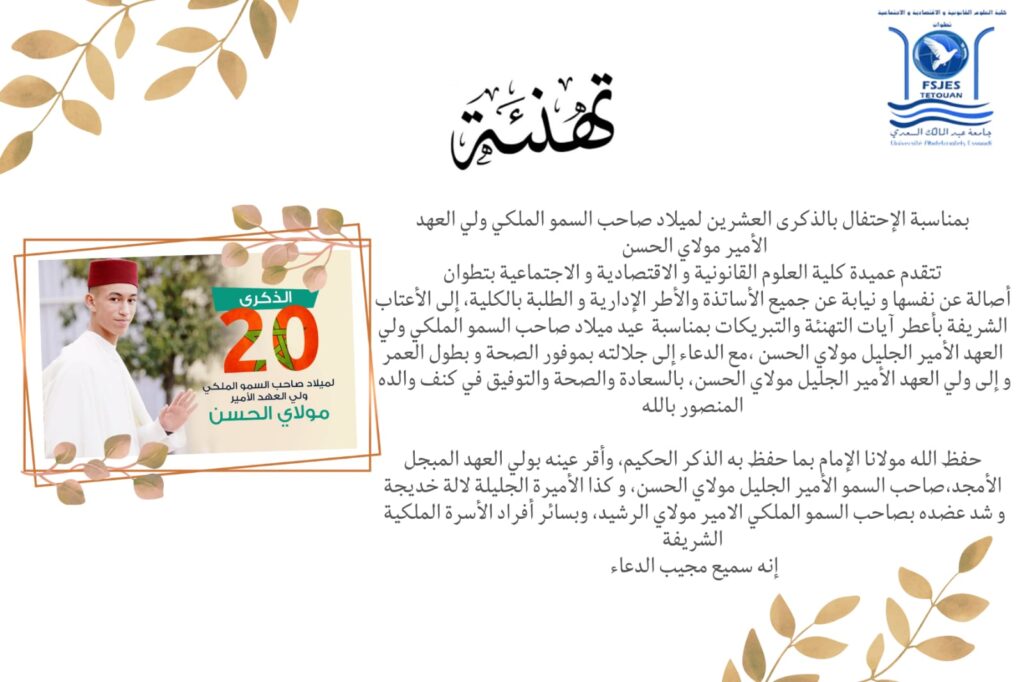 بمناسبة الاحتفال بالذكرى العشرين لميلاد صاحب السمو الملكي ولي العهد الأمير مولاي الحسن، تتقدم عميدة كلية العلوم القانونية والاقتصادية والاجتماعية بتطوان السيدة مارية بوجداين، أصالة عن نفسها ونيابة عن جميع الأساتذة والأطر الإدارية والطلبة بالكلية، إلى الأعتاب الشريفة بأعطر آيات التهنئة والتبريكات بمناسبة عيد ميلاد صاحب السمو الملكي ولي العهد الأمير الجليل مولاي الحسن، مع الدعاء إلى جلالته بموفور الصحة وبطول العمر وإلى ولي العهد الأمير الجليل مولاي الحسن، بالسعادة والصحة والتوفيق في كنف والده المنصور بالله.
