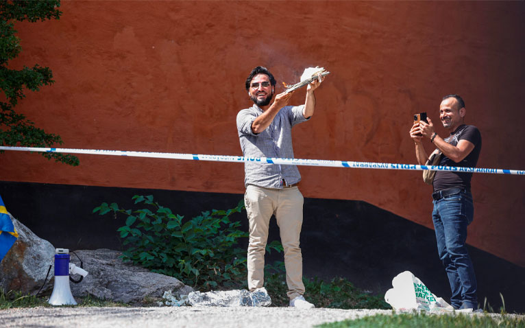أقدم أحد المتطرّفين أمام المسجد الكبير بستوكهولم في السويد تحت حماية السلطات على حرق نسخة المصحف الشريف، في يوم عيد الأضحى المبارك.