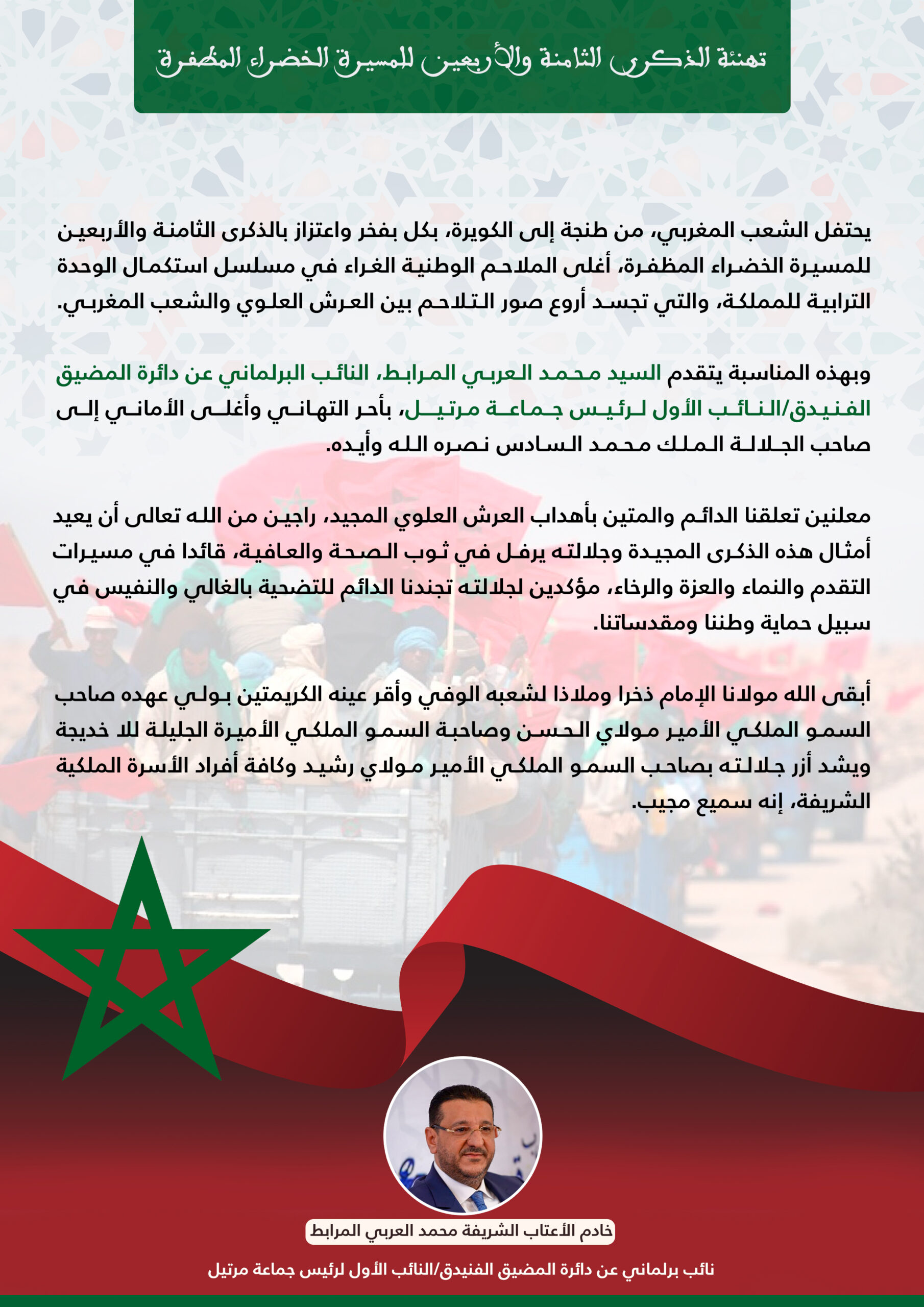 محمد العربي المرابط النائب البرلماني عن دائرة المضيق الفنيدق يهنئ الملك محمد السادس بمناسبة حلول ذكرى المسيرة الخضراء شمال بريس سنتين ago