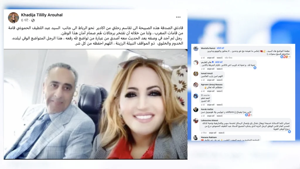 الصورة نشرتها ابنة مدينة تيزنيت البرلمانية والفاعلة بالمجالات السياسية والحقوقية والثقافية خديجة تيليلي أروهال، على حسابها على الفايسبوك، مرفقة بتعليق جاء فيه: “قادتني الصدفة هذه الصبيحة الى تقاسم رحلتي من اكادير نحو الرباط الى جانب السيد عبد اللطيف الحموشي قامة من قامات المغرب ، ولنا من خلاله أن نفتخر برجالات هُم صمام أمان هذا الوطن. رجل لم أجد في وصفه بعد الحديث معه أصدق من عبارة من تواضع لله رفعه ، هذا الرجل المتواضع الوفي لبلده، الخدوم والخلوق، ذو المواقف النبيلة الرزينة ، اللهم احفظه من كل شر”.