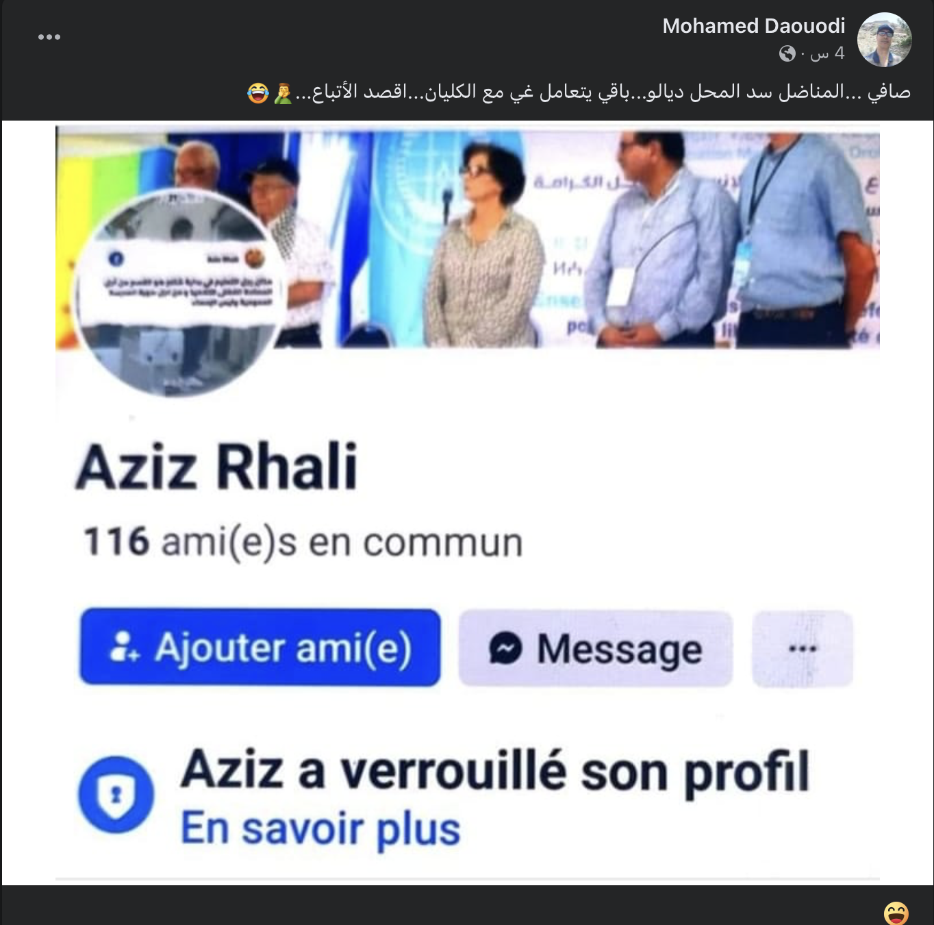 ومن جهة أخرى، دون الأستاذ محمد الداودي من إقليم الحسيمة عبر حسابه الفايسبوكي، قائلا: ” صافي.. المناضل سد المحل ديالو.. باغي يتعامل مع الكليان.. أقصد الأتباع..” إذ يشير في تدوينته هاته لحساب عزيز غالي الفايسبوكي، الذي قام ليلة أمس بإغلاقه ليبقى فقط حكرا على متتبعيه.