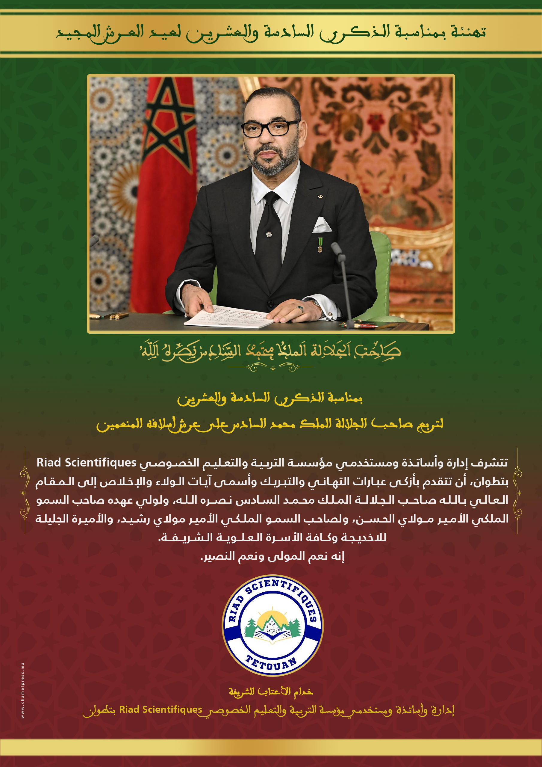 بمناسبة الذكرى السادسة والعشرين لتربع صاحب الجلالة الملك محمد السادس على عرش أسلافه المنعمين. تتشرف إدارة وأساتذة ومستخدمي مؤسسة التربية والتعليم الخصوصي Riad Scientifiques بتطوان، أن تتقدم بأزكى عبارات التهاني والتبريك وأسمى آيات الولاء والإخلاص إلى المقام العالي بالله صاحب الجلالة الملك محمد السادس نصره الله، ولولي عهده صاحب السمو الملكي الأمير مولاي الحسن، ولصاحب السمو الملكي الأمير مولاي رشيد، والأميرة الجليلة للاخديجة وكافة الأسرة العلوية الشريفة. إنه نعم المولى ونعم النصير.
