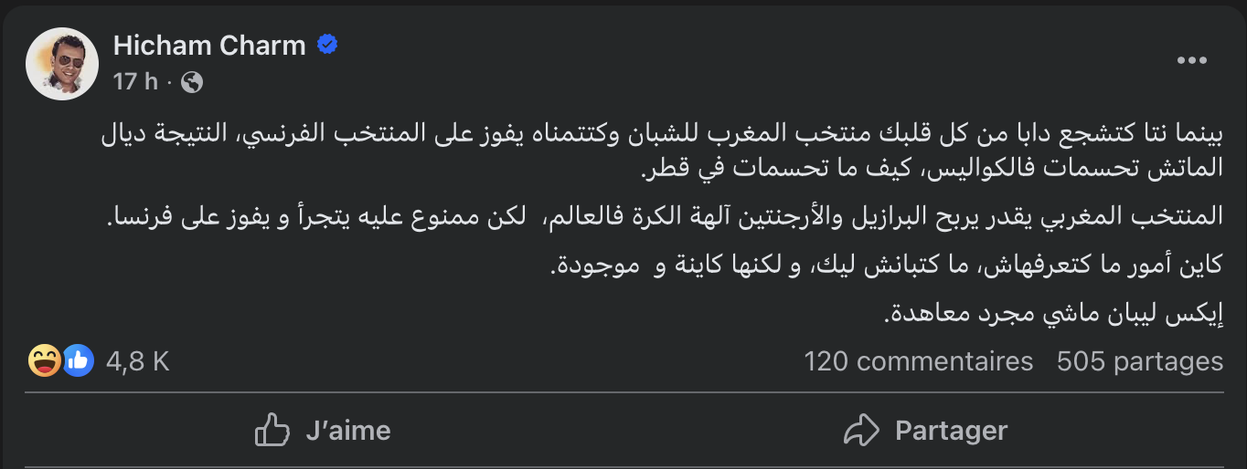 بينما يعيش المغرب واحدة من أنصع مراحل تاريخه الحديث، بفضل رؤية ملكية استباقية وإنجازات تنموية ورياضية غير مسبوقة، يصر بعض الأشخاص على الغرق في مستنقع العدمية، رافعين شعار التبخيس والسخرية من كل ما هو وطني. هذا النوع من الخطاب الذي يتسلل إلى مواقع التواصل الاجتماعي تحت غطاء “حرية الرأي” ليس سوى ترجمة لأزمة فكرية وقيمية عميقة لدى من فقدوا القدرة على التمييز بين النقد المسؤول والعدمية الهدامة. تدوينة الفايسبوكي هشام شارم الأخيرة نموذج صارخ لهذه العدمية التي تتغذى من التهكم وتقتات من جلد الذات، حين حاول بخفة أن يسخر من المنتخب المغربي ويختزل مجده الكروي العالمي في مجرد صدفة أو حظ، متناسياً أن ما تحقق في مونديال قطر لم يكن إلا ثمرة جهد أجيال وتضحيات شباب رفعوا راية الوطن في سماء المجد الرياضي.