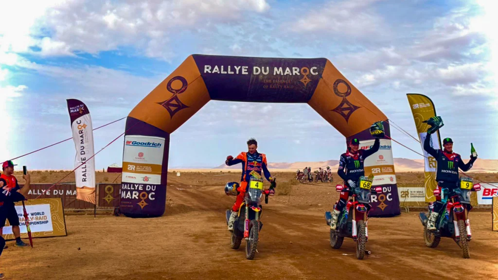 شهدت النسخة الحالية منافسة قوية بين أبرز الأسماء العالمية في عالم الراليات، وجاءت نتيجتها النهائية حافلة بالمفاجآت والتتويجات المميزة. ففي فئة الدراجات النارية، تمكن الإسباني “توشا شارينا” من حسم لقب رالي المغرب بعد تفوقه في المرحلة الخامسة والأخيرة بزمن قدره 2:24:35 ساعة، متقدماً على الأسترالي “دانيال ساندرز” (KTM) بفارق 42 ثانية، والأمريكي “ريكي برابيك” بفارق دقيقة و53 ثانية.