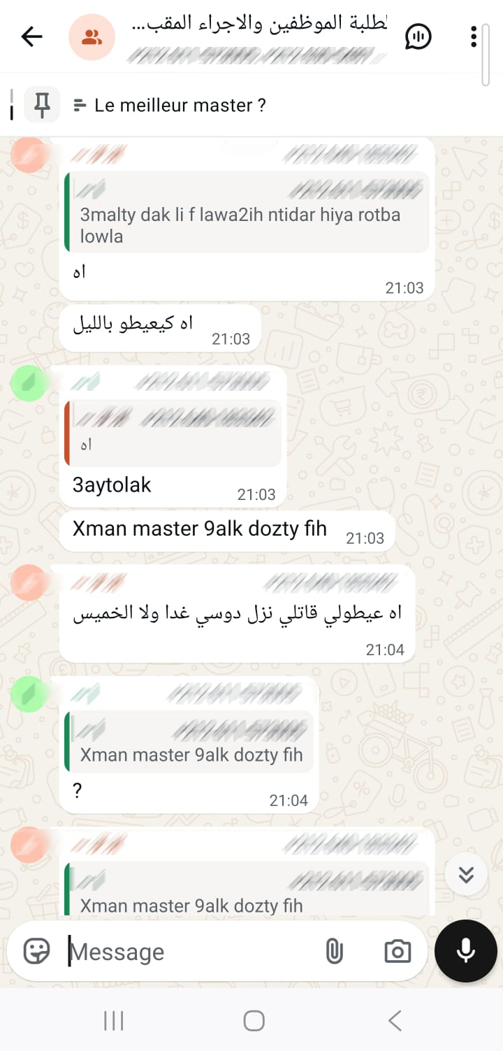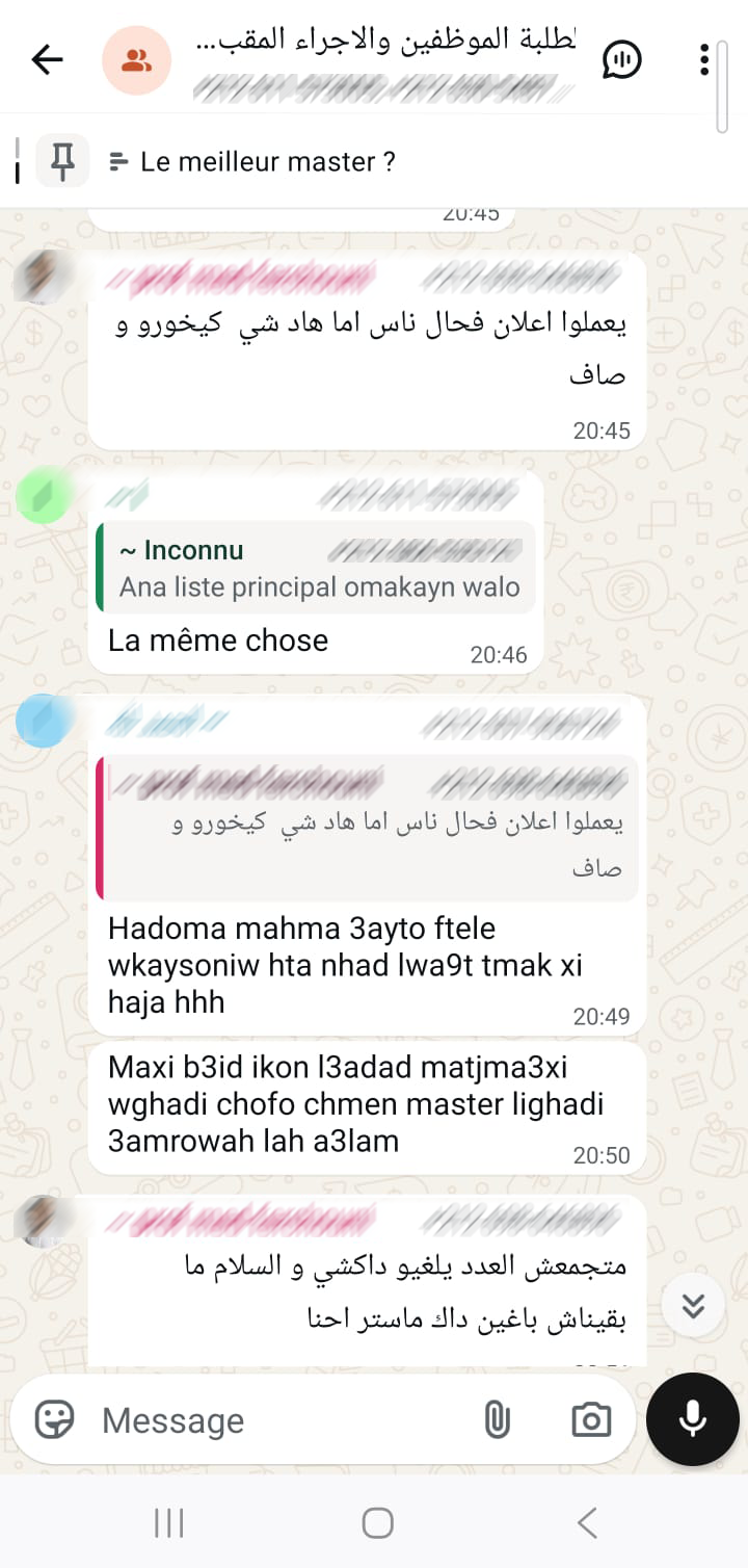 وفي هذا السياق، توصلت شمال بريس بمعطيات ومعاينات ميدانية من بينها نقاشات دارت داخل مجموعة واتساب خاصة بالطلبة الموظفين المترشحين لماستر الزمن الميسر، تعكس حجم الإحباط الذي بلغته هذه الفئة، تساؤلات متكررة وغموض عن مصير ماستر الزمن الميسر خصوصا وأننا مقبلين على شهر فبراير، واعترافات صريحة بفقدان الشغف تجاه مسلك كان يفترض أن يشكل فرصة للتكوين والترقي، فإذا به يتحول في نظر كثيرين إلى عنوان للارتباك والضبابية بسبب سوء التدبير.